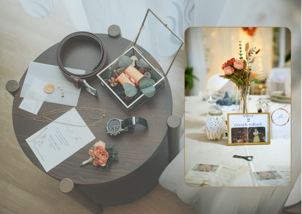 Az alábbi képek azt szemléltetik, ahogy egy eseményre is tekintek a munkám során: harmóniában gondolkodom, ahol a finoman összeválogatott részletek együtt képezik a történet egészét.